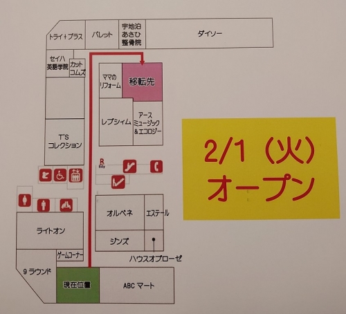 現在、ABCマートさんの隣りに店舗がございますが、ダイソーさんの向かいへ引っ越し致します。
